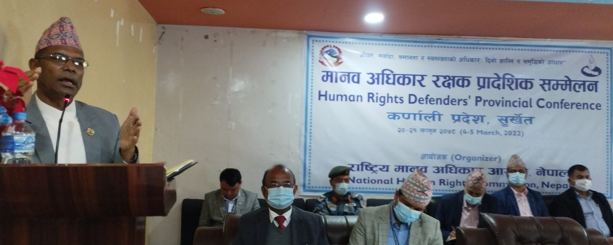 राष्ट्रिय मानव अधिकार आयोगका सहसचिव नवराज सापकोटाको अध्यक्षतामा भएको मानव अधिकार रक्षकहरुको कर्णाली प्रदेश स्तरको सम्मलेन उद्घाटन कार्यक्रममा कर्णाली प्रदेश सरकारका मुख्य न्यायाधिवक्ता ध्रुवकुमार श्रेष्ठ, सुुर्खेतका सहायक प्रमुख जिल्ला अधिकारी इश्वरीप्रसाद पाण्डे, राष्ट्रिय मानव अधिकार आयोगका कर्णाली प्रदेश प्रमुख बुद्धनारायण साहनीले पनि बोलेका थिए ।