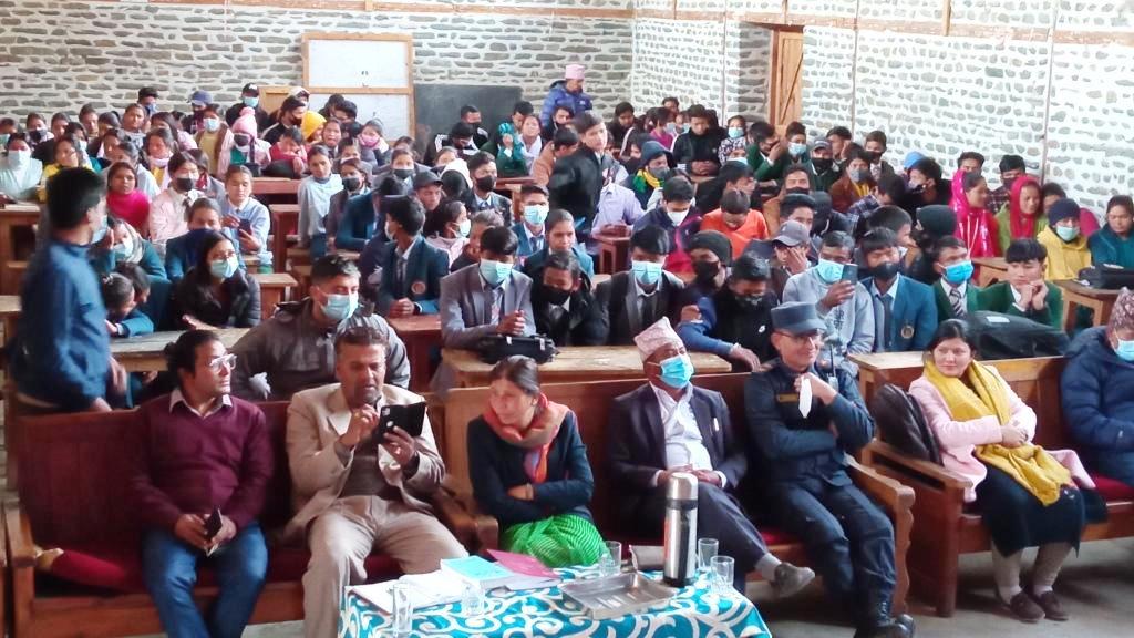 यसैबीच शुक्रबार जिल्ला प्रहरी कार्यालय,सरकारी वकिल कार्यालय र कर्णाली स्वास्थ्य विज्ञान प्रतिष्ठानको संयुक्त आयोजनामा कर्णाली प्राविधिक शिक्षालय जुम्लामा लागु औषध तथा दुुव्र्यसनी,महिला हिंसा,साइबर अपराध विरुद्ध सचेतना तथा मुलुकी अपराध संहित २०७४, का कानुनी प्रावधान,बाल बिवाह,महिला हिंसा विरुद्ध कसुरका विषयमा अभिमुखीकरण गरिएको छ ।