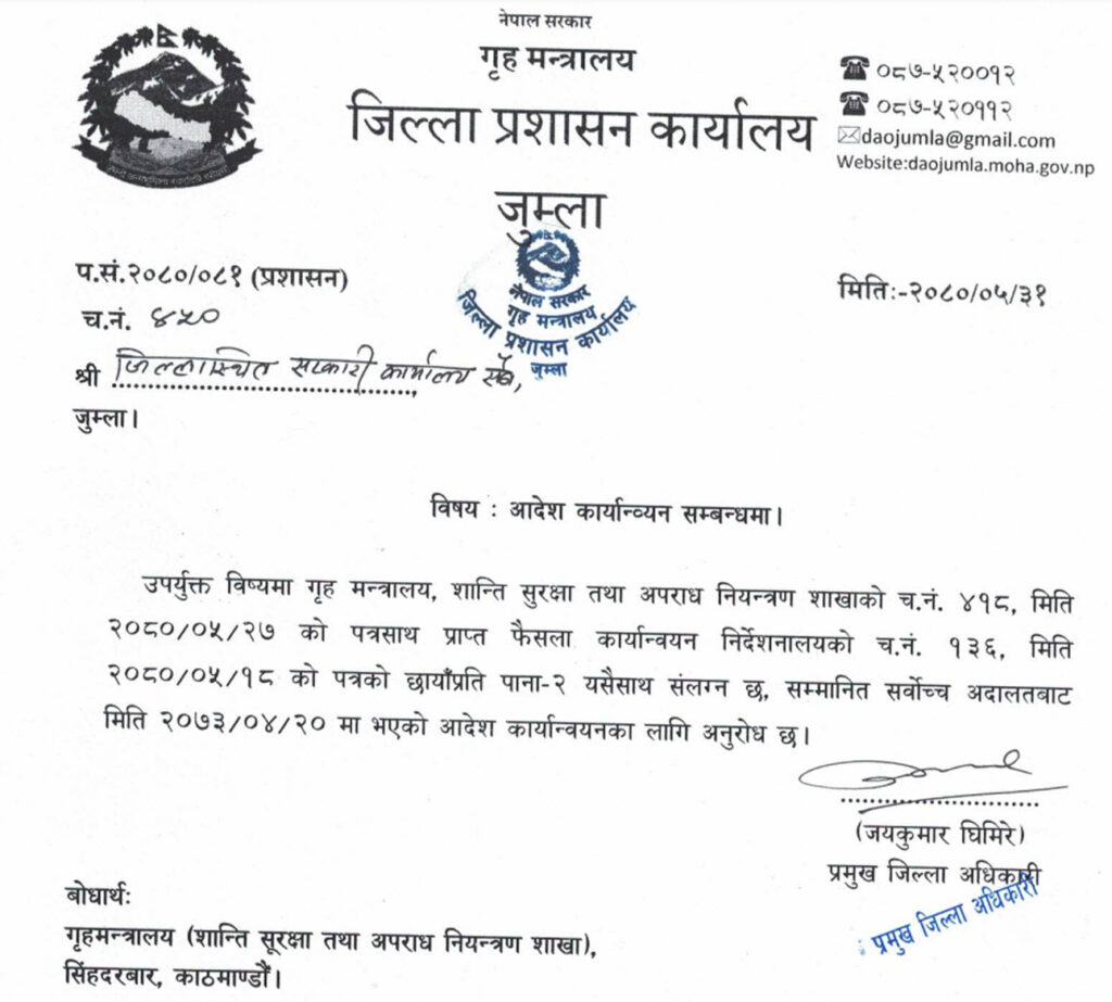 जुम्ला ः धर्म संस्कृतिका नाममा पशु बलि नदिन जिल्लाका सवै सरकारी कार्यालयलाई जिल्ला प्रशासन कार्यालय जुम्लाले आदेश गरेको छ । सर्वाेच्च अदालतको फैसला कार्यन्वयन गर्न गृहमन्त्रालयमार्फत आएको आदेश अनुसार जिल्ला सरकारलाई परिपत्र गरी आदेश गरेको हो ।