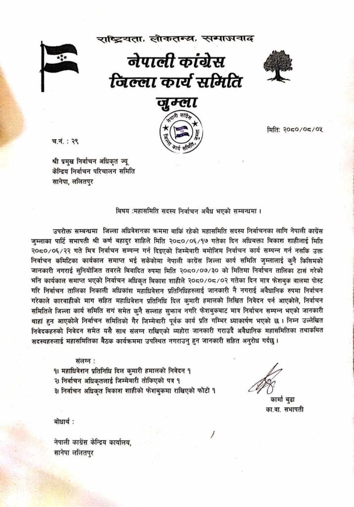 उनीहरुले अधिवक्ता विकाश शाही अधिकृत भएको महासमिति सदस्य चयन निर्वाचन समितिले नेपाली कांग्रेस कर्णाली प्रदेश सभापति ललितजंग शाहीले निर्देशन अनुसार काम गरेका आरोप लगाएका छन् । निर्वाचन अधिकृतले असोज २२ गतेसम्म निर्वाचन सम्पन्न गर्न जिम्मेवारी प्राप्त गरेको हुन् । तर कार्तिक ३० गते सुचना टाँस गरियो । मंसिर ५ गते महासमितिको निर्वाचन गरियो । निर्वाचन गर्न तोकिएको म्याद भित्रै गर्नुपर्ने हो तर कसैलाई थाहाँ नदिएरै निर्वाचन गरियो ।