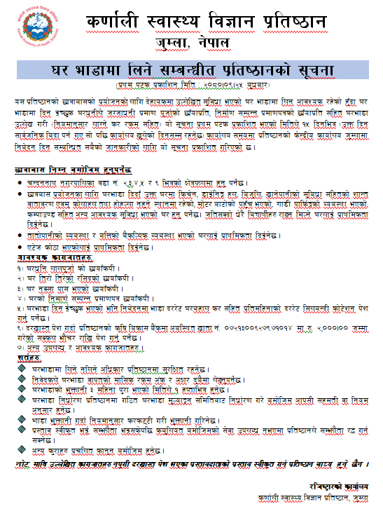 यस प्रतिष्ठानको छात्राबासको प्रयोजनको लागि देहायकमा उल्लेखित सुविधा भएको घर भाडामा लिन आवश्यक रहेको हुँदा घर भाडामा दिन इच्छुक घरधनीले जग्जाधनी प्रमाण पूर्जाको छाँयाप्रति, निर्माण सम्पन्न प्रमाणपत्रको छाँयाप्रति सहित घरभाडा उल्लेख गरी (नियमानुसार लाग्ने कर रकम सहित) यो सूचना प्रथम पटक प्रकाशित भएको मितिले १५ दिनभित्र (उक्त दिन सार्वजनिक बिदा पर्न गए सो पछि कार्यालय खुलेको दिनसम्म रहनेछ) कार्यालय समयमा प्रतिष्ठानको केन्द्रीय कार्यालय जुम्लामा निबेदन दिन सम्बन्धित सबैको जानकारीको लागि यो सूचना प्रकाशित गरिएको छ ।