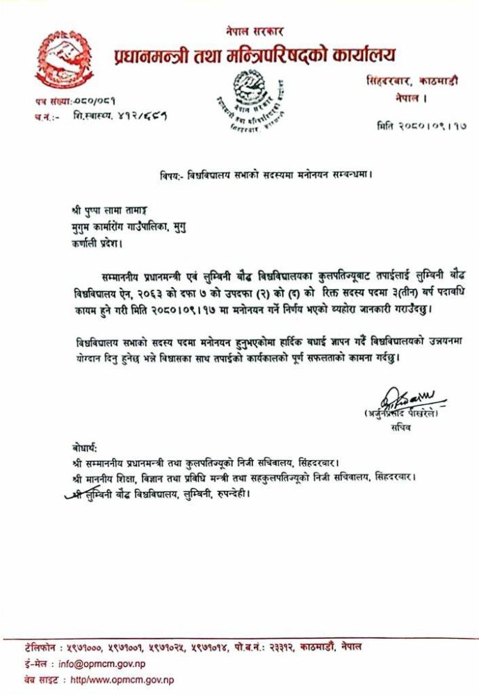 प्रधानमन्त्री तथा कुलपतिले लुम्विनी बौद्ध विश्वविद्यालय ऐन, २०६३ को दफा ७ को उपदफा (२) को (द) को रिक्त रदस्य पदमा तीन वर्ष पदावधि कायम हुने गरी २०८० पुस १७ गते लामालाई सदस्य मनोनयन गर्ने निर्णय भएको हो ।