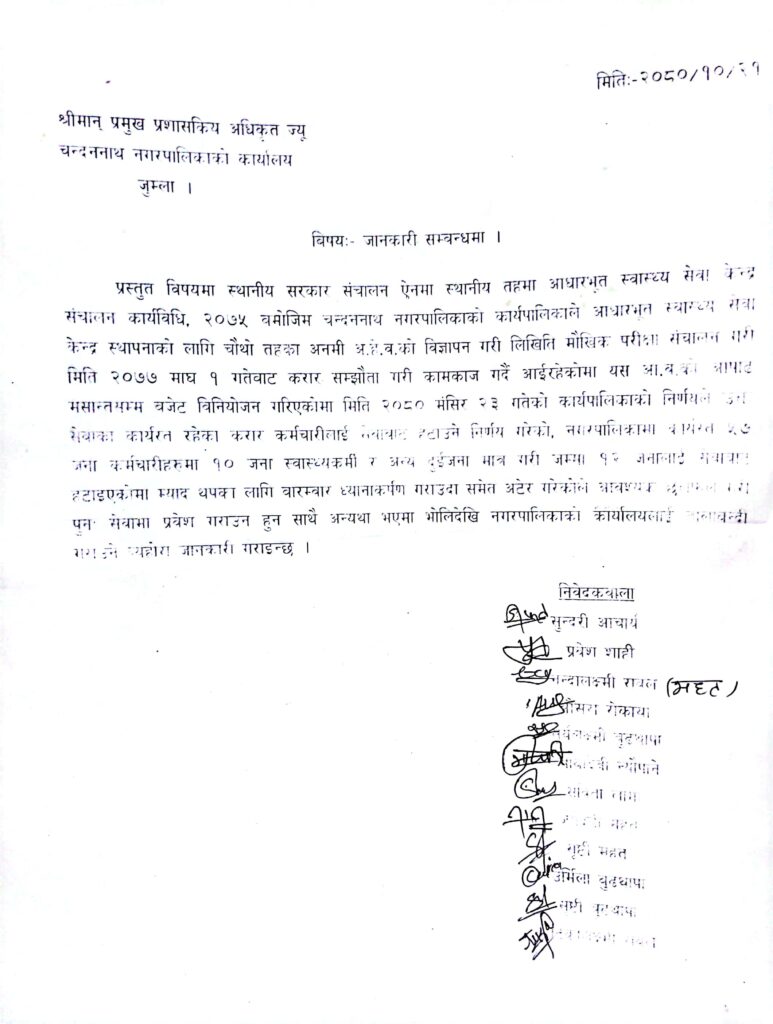 आईतबार चन्दननाथ नगरपालिकाका प्रमुख प्रशासकिय अधिकृत समक्ष ज्ञापन बुझाउदै चालू आवकाे असार सम्म तलब भत्ताकाे बजेट समेत विनियाेजन भईसकेकाेले नियमित काममा फिर्ता गर्न माग गरेका हुन् ।