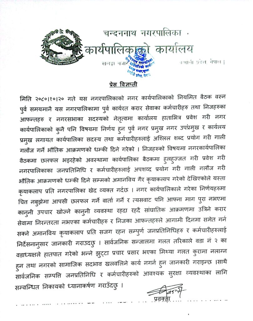 विवाद भएको भिडियो सार्वजानिक भएपछि चन्दननाथ नगरपालिकाले आईतबार विज्ञप्ती सार्वजानिक गरेको छ ।