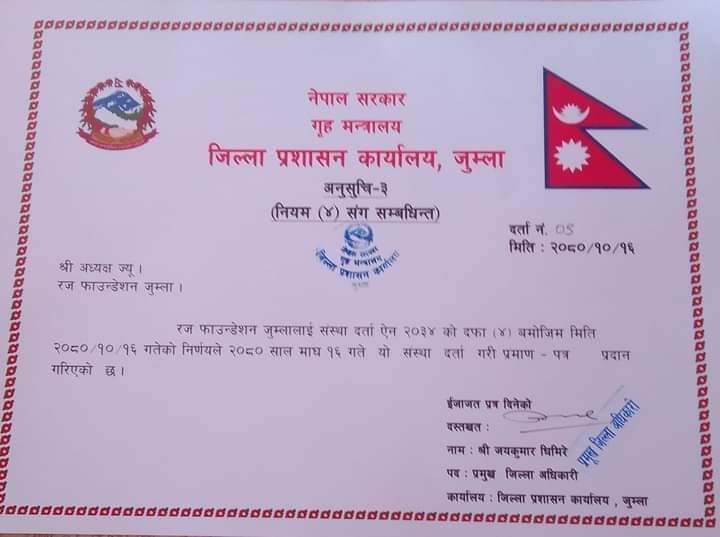 जुम्ला : हिमा गाउँपालिका जुम्लाका निर्वतमान अध्यक्ष रजबहादुर शाहीको नाममा रज फाउण्डेसन दर्ता गरिएको छ । जिल्ला प्रशासन कार्यालय जुम्लामा संस्था दर्ता ऐन २०३४ को दफा (४) बमोजिम माघ १६ गते दर्ता भएको हो ।