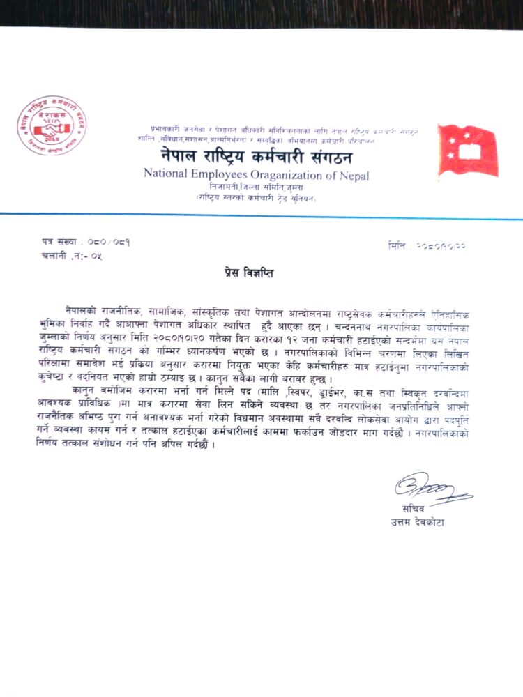 विभिन्न चरणमा लिएका लिखित परिक्षामा समावेश भई प्रक्रिया अनुसार करारमा नियुक्त भएका केहि कर्मचारीहरु मात्र हटाउनुमा नगरपालिकाको कुचेष्टा र बदनियत भएको नेपाल राष्ट्रिय कर्मचारी संगठनको दाबी छ ।