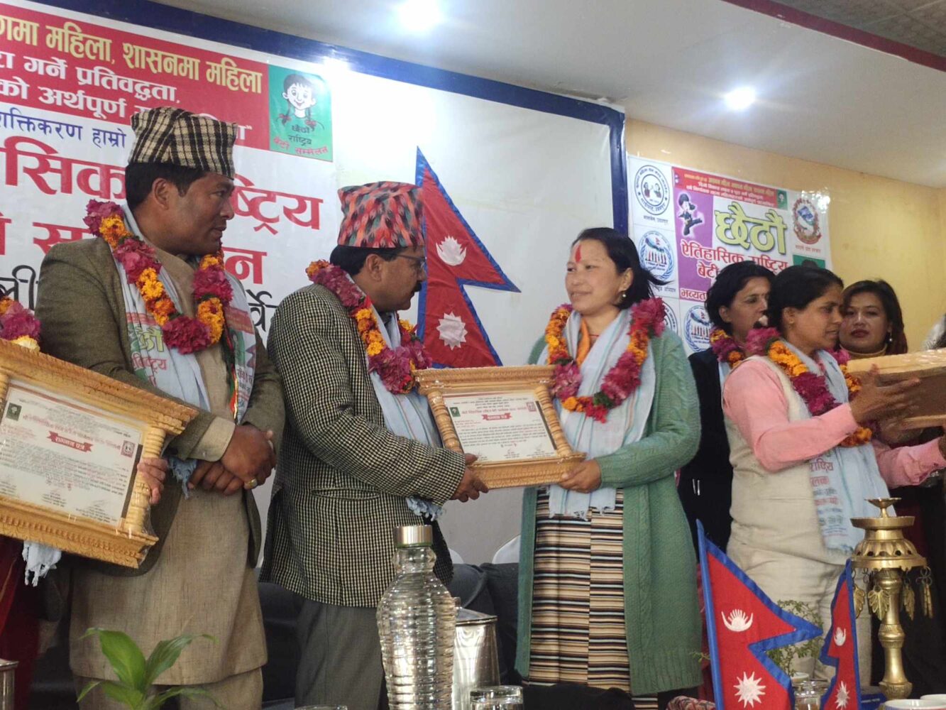 आशनमा महिला, शासनमा महिला र भाषणमा महिला भन्ने मुल नारा बाेकेकाे मुलधार महिला सेवा केन्द्रले दिगो बिकाश लक्ष्य पूरा गर्ने प्रतिबद्धता, सबै निर्णायक तहमा महिलाहरूको अर्थपूर्ण सहभागीता भन्ने नारासहितको ऐतिहासिक छैटौं राष्ट्रिय बेटि बचाउ सम्मेलनकाे अबसरमा सदस्य तामाङ चेलीबेटी सशक्तीकरण सम्मान २०८० ले सम्मानित हुनु भएको अध्यक्ष नजबुल खांनले बताए ।