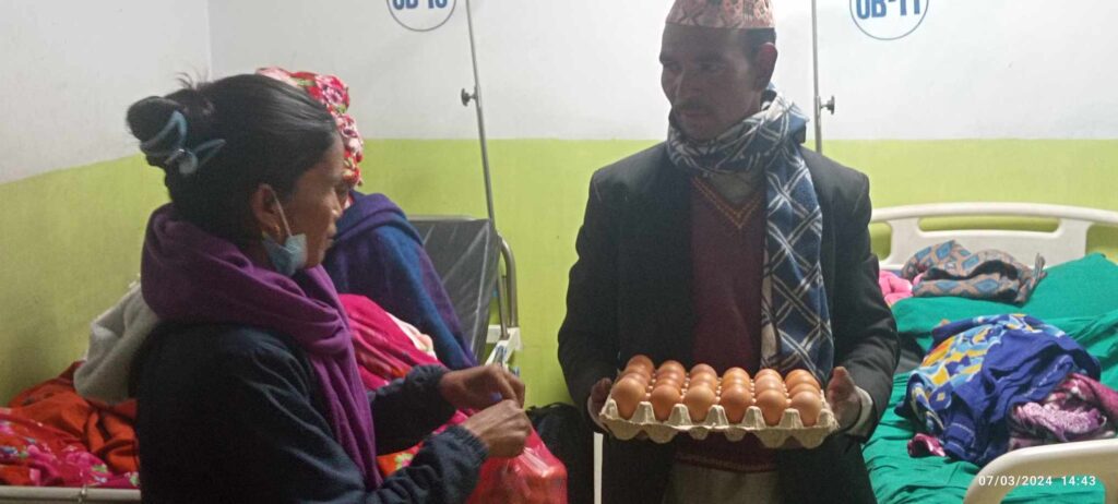 जुम्ला-कर्णाली स्वास्थ्य विज्ञान प्रतिष्ठान शिक्षण अस्पताल जुम्लाको प्रसुति वाडमा रहेको सुत्केरी महिलालाई पोषणयूक्त आहार अण्डा र फलफुल वितरण गरिएको छ । चन्दननाथ नगरपालिका महिला बालबालिका शाखाले ११४ औँ महिला दिवसको अवसरमा सुत्केरी महिलालाई पोषणयुक्त आहारा (अण्डा र फलफुल) वितरण गरिएको हो ।