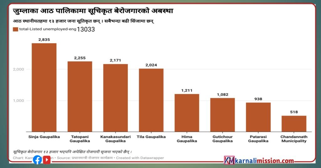 जसमा पालिकागत रुपमा हेर्दा सबैबढी सिंजा गाउँपालिकामा २८ सय ३५ जना सूचिकृत बेरोजगार रहेका छन् । जस पुरुष ११ सय ३५ र महिला १७ सय रहेका छन् । भने रोजगारी २५० जनाले मात्रै पाएका छन् ।