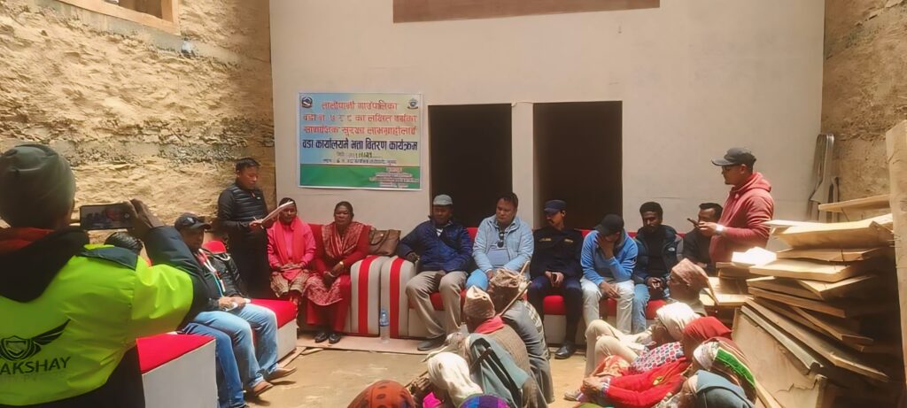 जसअन्तर्गत पहिलाे दिन साेमबार वडा नं.७ का ६८ वर्ष माथिका ३८ जना जेष्ठनागरिक र ६ जना अशक्त अपाङ्गगरी ४४ जनालाई गाउँमै पुगेर भत्ता वितरण गरिएकाे ताताेपानी गाउँपालिका अध्यक्ष नन्दप्रसाद चाैलागाईले बताए ।