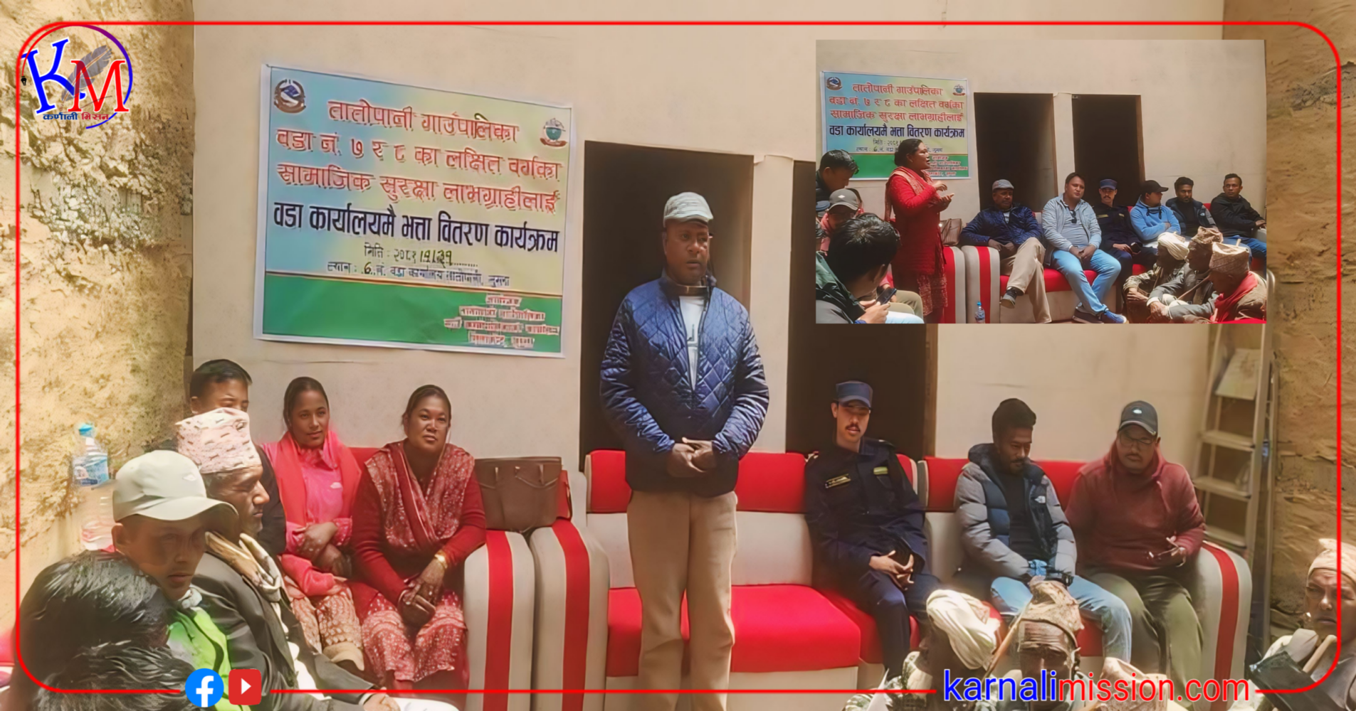 ताताेपानीकाे भेरीखाेला क्षेत्रमा पर्ने वडा नं.७ र ८ का ६८ वर्ष माथिका जेष्ठनागरिक र शारिरिक रुपमा अशक्त लाई घरदैलाेमै पुगेर तेस्राे किस्ताकाे सामाजिक सुरक्षा भत्ता वितरण गर्न थालेकाे हाे ।