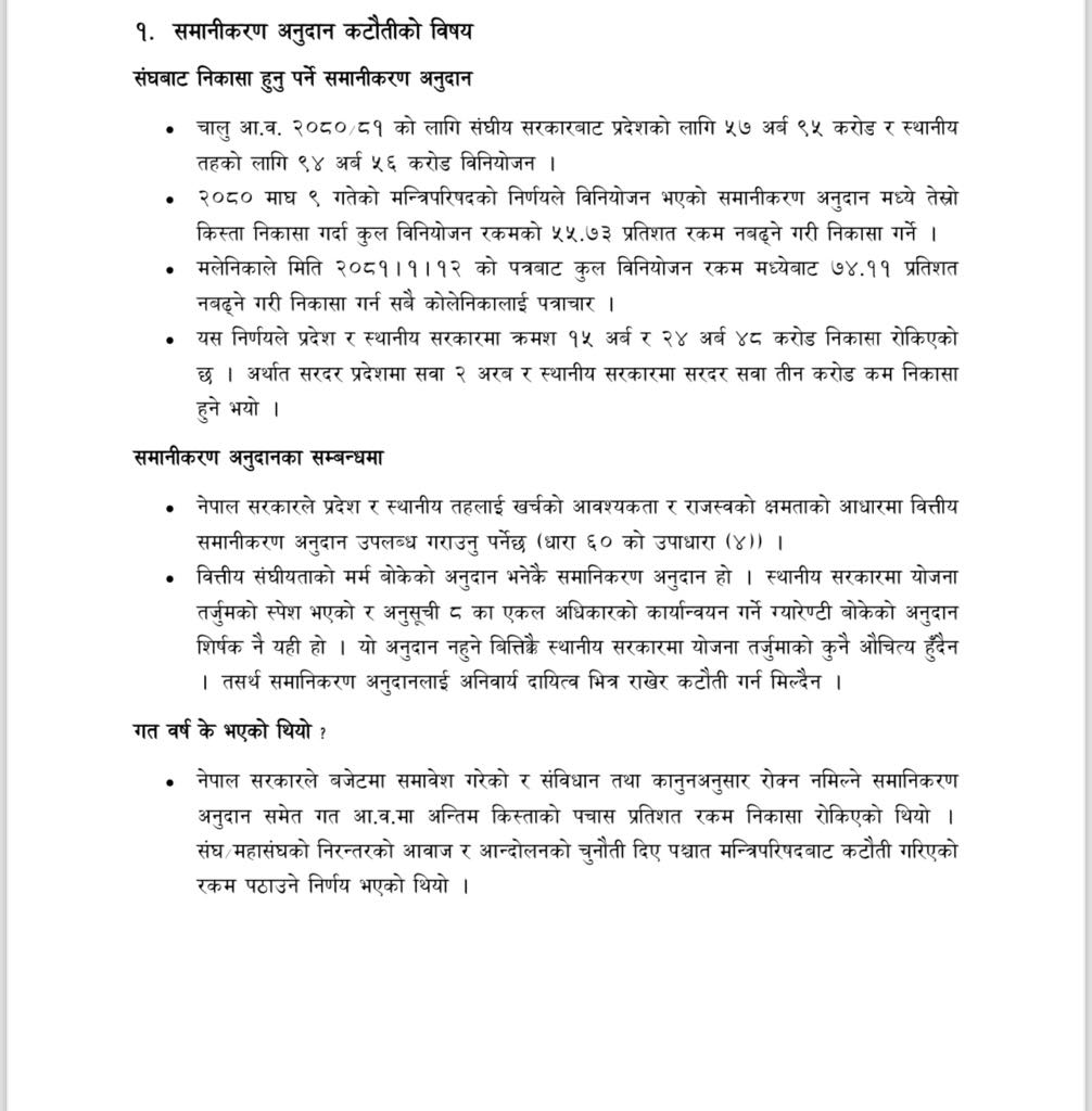 संघिय सरकारबाट प्रदेश र स्थानीय तहमा पठाउनु पर्ने समानीकरण अन्तर्गतको बजेट रोकिएपछि निकासाका लागि माग गरिएको । गाउँपालिका राष्ट्यि महासंघका केन्द्रीय उपाध्यक्ष लक्ष्मण बहादुर शाहीले अर्थमन्त्री वर्षामान पुनलाई भेटेर समानीकरण अनुदानको सबै बजेट निकासा गरिदिन माग गरेका हुन् ।