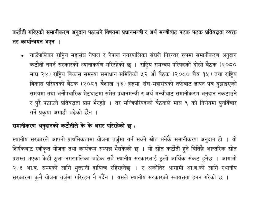 समानीकरण अनुदान कटौती नगर्न गाउँपालिका राष्ट्रिय महासंघ र नगरपालिका संघले निरन्तर सरकारको ध्यानाकर्षण गरिरहेको छ । विभिन्न समयको भेटघाटमा समेत प्रधानमन्त्री र अर्थ मन्त्रीबाट समानीकरण अनुदान नकटाउने र पुरै पठाउने प्रतिबद्धता प्राप्त भएपनि निकासाको प्रक्रिया अघि बढेको छैन् ।
