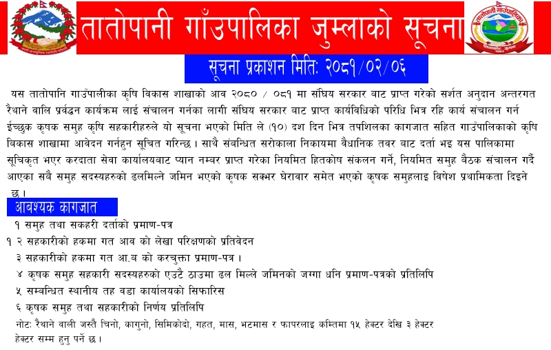 तातोपानी गाउँपालिका जुम्लाको सूचना