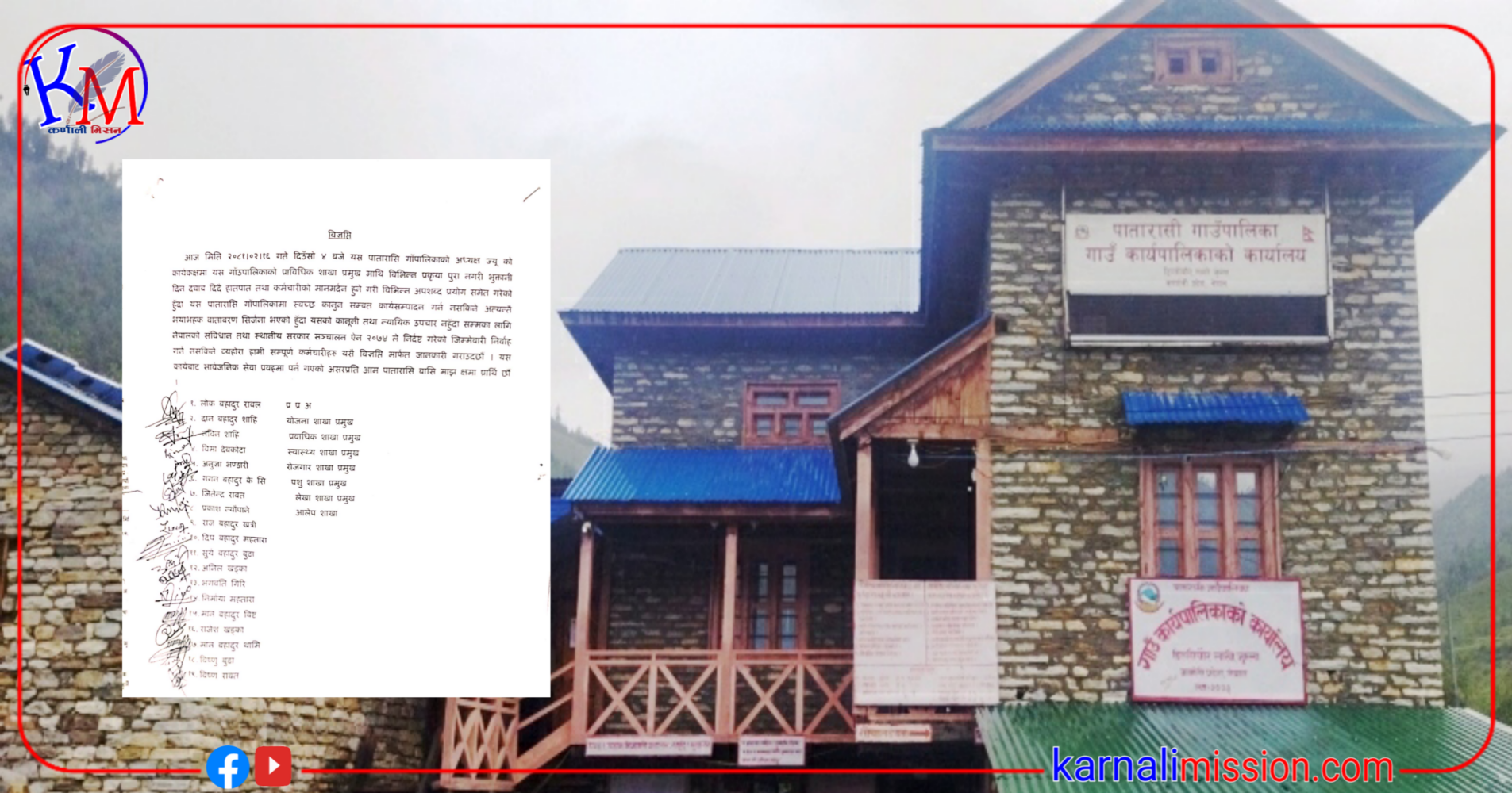 त्यसैले यसको कानूनी तथा न्यायिक उपचार नहुँदा सम्मका लागि नेपालको संविधान तथा स्थानीय सरकार सञ्चालन ऐन २०७४ ले निर्दष्ट गरेको जिम्मेवारी निर्वाह गर्न नसकिने व्यहोरा हामी सम्पूर्ण कर्मचारीहरु यसै विज्ञप्ति मार्फत जानकारी गराउदछौं । यस कार्यबाट सार्वजनिक सेवा प्रवहमा पर्न गएको असरप्रति आम पातारासि बासि माझ क्षमा प्रार्थि छौं ।’