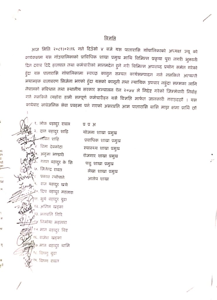 प्रशासकिय अधिकृत सहित १४ जना कर्मचारीद्धारा हस्ताक्षेरित विज्ञप्तीमा भनिएको छ,‘मिति २०८१।०२।१६ गते दिउँसो ४ बजे पातारासी गॉउँपालिकाको अध्यक्ष ज्यूको कार्यकक्षमा प्राविधिक शाखा प्रमुख माथि विभिन्न प्रकृया पुरा नगरी भुक्तानी दिन दवाब दिदै हातपात तथा कर्मचारीको मानमर्दन हुने गरी विभिन्न अपशब्द प्रयोग समेत गरेको हुँदा यस पातारासी गाँपालिकामा स्वच्छ कानुन सम्वत कार्यसम्पादन गर्न नसकिने र अत्यन्तै भयाभहक वातावरण सिर्जना भएको छ ।