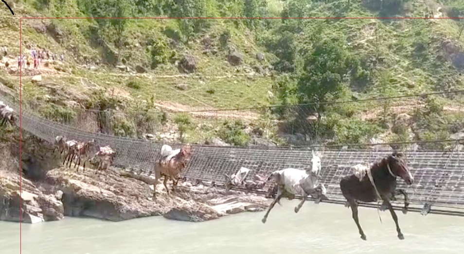 अछाम । अछामको पन्चदेवल विनायक नगरपालिका ९ मा झोलुङ्गे पुल चुडिडा १५ वटा खच्चड फसेका छन् । अछाम र दैलेख जोड्ने कर्णाली नदीमाथिको झोलुङ्गे पुलमा फसेका खच्चडको उद्धारमा समस्या भएको छ ।