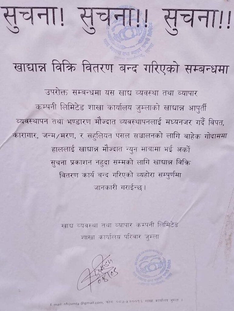 जुम्ला खाद्य व्यवस्था तथा व्यापार कम्पनी लिमिटेड शाखा जुम्लाले सार्वसाधारणलाई अनुदानको चामल वितरण कार्य वन्द गरेको छ । अनुदनको चामल गोदाममा अभाव भएपछि वितरण गर्न साउन ९ गतेदेखि गरेको हो ।