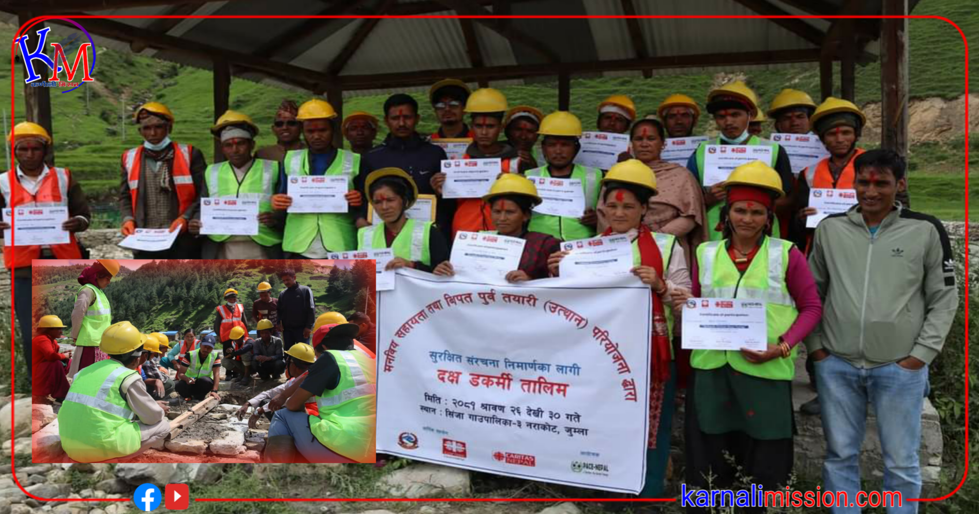 जुम्ला । जुम्लाको सिंजा गाउँपालिकाका स्थानीयलाई भूकम्प प्रतिरोध पूर्वाधार निर्माणका लागि दक्ष मिस्त्री तालिम दिइएको छ । पछिल्लो समय बढ्दो भुकम्पीय जोखिमलाई मध्यनजर गर्दै भूकम्प प्रतिरोधी पूर्वाधार निर्माणका लागि दक्ष मिस्त्री डर्कमी तालिम दिईएको हो ।