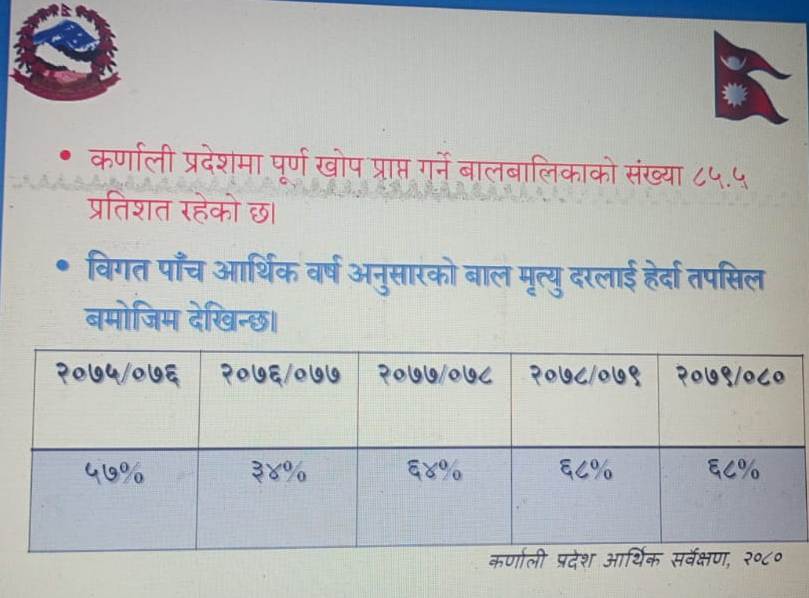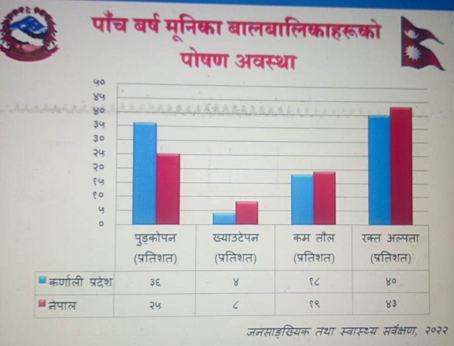 कर्णाली प्रदेश भर पूर्ण खोप प्राप्त गर्ने बालबालिकाको सङ्ख्य ८५.५ प्रतिशत भएको छ । तर जनसाङ्ख्यिक तथा स्वास्थ्य सर्वेक्षण २०२२ अनुसार पाँच वर्षसम्मका बालबालिकाको पोषण अवस्था सुधारन्मुख देखिएको छ । ०७५ सालमा बालबालिकामा पुड्कोपना ५५ प्रतिशत रहेको थियो । ०८० सालमा ३६ प्रतिशतमा झरेको तथ्याङ्कमा देखिन्छ । यस्तै ०७५ सालमा स्याउटेपन ८ प्रतिशत रहेकोमा ०८० सालमा ४ प्रतिशतमा झरेको छ । ०७५ सालमा कमतौल भएका बालबालिका ३६ प्रतिशत रहेको थियो । ०८० सालमा आएर १८ प्रतिशतमा रहेको देखिन्छ ।
