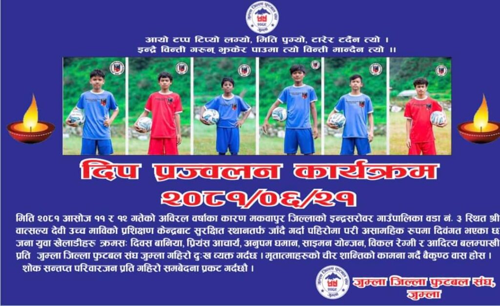 असोज ११ र १२ गते मकवानपुर जिल्लाको इन्द्रसरोवर गाउँपालिका – ३ स्थित वाल्सत्यदेवि उच्च माविको प्रशिक्षण केन्द्रबाट सुरक्षित स्थानतर्फ जार्दै गर्दा पहिरोमा परी निधन भएको खेलाडीहरुको सम्झनामा दीप प्रज्वलन गरिएको छ ।