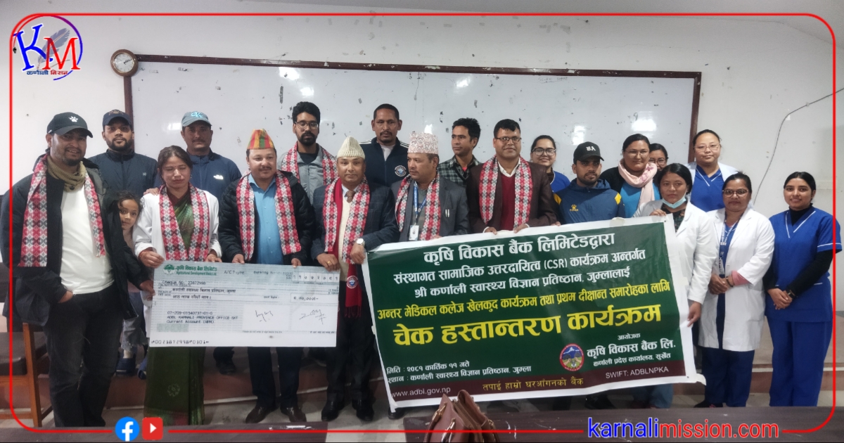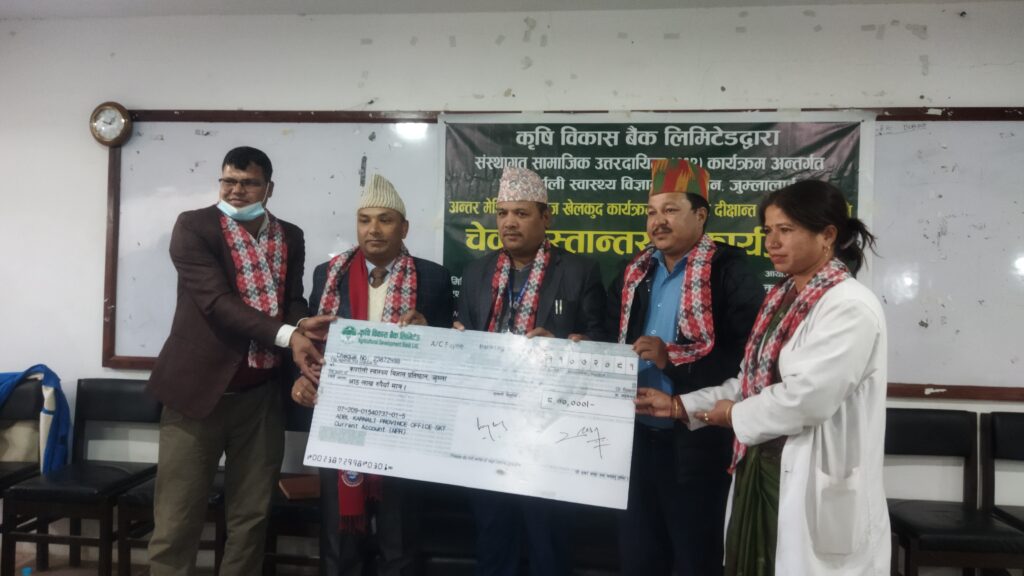 जुम्ला । कृषि विकास बैंक लिमिटेड जुम्ला शाखाद्दारा कर्णाली स्वास्थ्य विज्ञान प्रतिष्ठान जुम्लालाई आठ लाखकाे चेक हस्तान्तरण गरिएकाे छ।