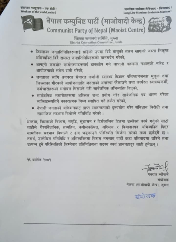 सांसद शाहीले जनप्रतिनिधिलाई गालीगलोजप्रति नेकपा माओवादी केन्द्र जुम्लाले आपत्ति जनाएको छ । जनप्रतिनिधिलाई साँढेको उपमा दिदै बाबुको तलव खाएको जस्ता निस्कृठ अभिव्यक्ति दिएर मापर्दन गरिएको भन्दै आपत्ति जनाएको हो ।