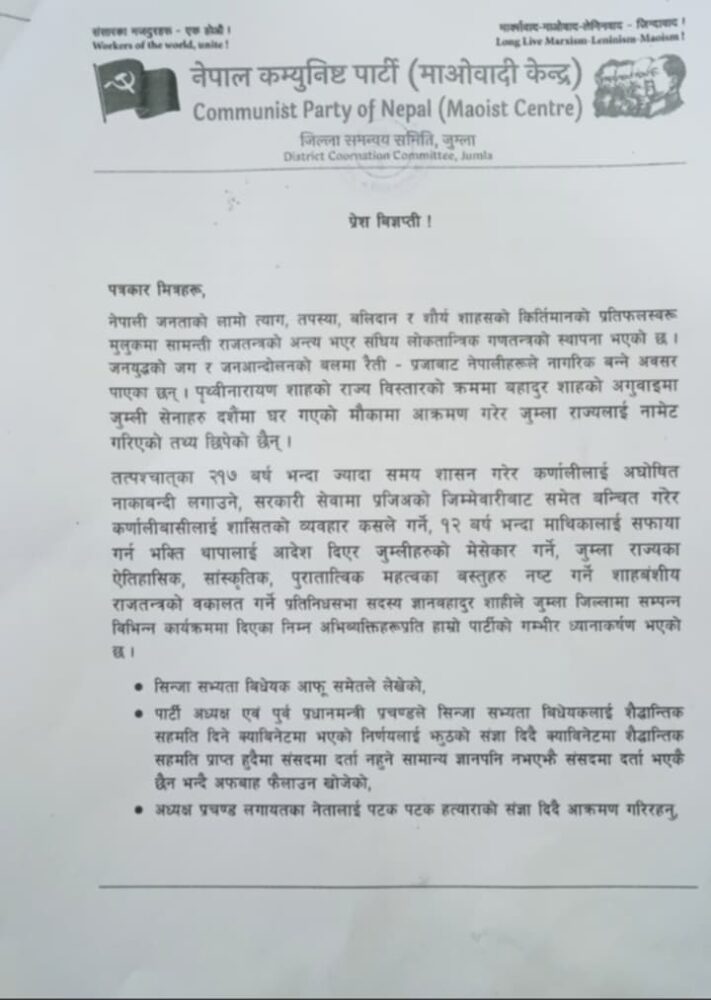 नेकपा माओवादी केन्द्र जुम्लाका जिल्ला संयोज नवराज न्यौपानेद्वारा जारी विज्ञप्तिमा शाहीले सिंजा सभ्यता विधेयकको विषयमा झूटो प्रचार गरेको उल्लेख गरिएको छ । पार्टी अध्यक्ष तथा पूर्वप्रधानमन्त्री पुष्पकमल दाहाल प्रचण्डलाई पटक–पटक ‘हत्यारा’ को संज्ञा दिएको, जनप्रतिनिधिप्रति अपमानजनक टिप्पणी गरेको प्रेस विज्ञप्तिमा उल्लेख छ ।