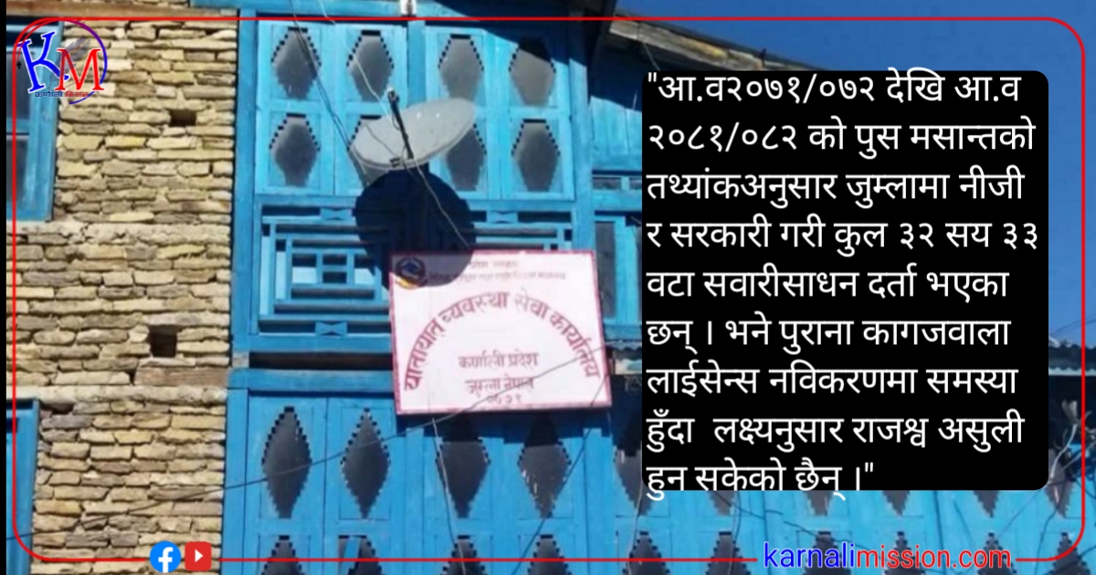 जुम्ला । यातायात व्यवस्था सेवा कार्यालय जुम्लाको १० वर्षको तथ्यांकलाई हेर्दा तीन हजार दुई सय बढी सवारीसाधन दर्ता भएको देखिन्छ । आर्थिक वर्ष २०७१/०७२ देखि आव २०८१/०८२ को पुस मसान्तसम्मको तथ्यांकअनुसार जुम्लामा निजी र सरकारी सवारीसाधन गरी कुल ३२ सय ३३ वटा सवारीसाधन दर्ता भएको कार्यालयको विवरणमा उल्लेख छ ।