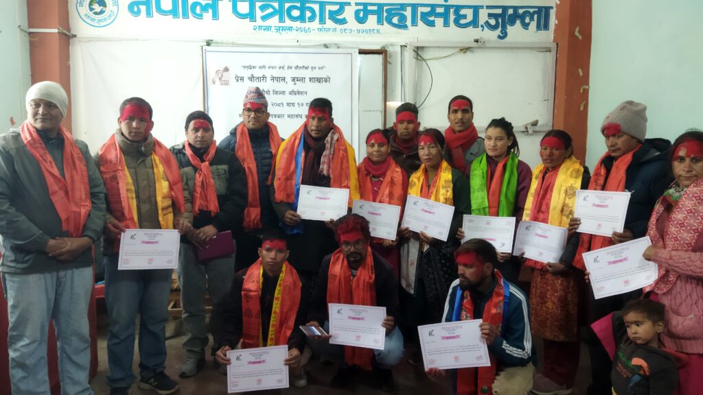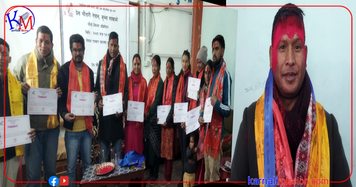 जुम्ला । पत्रकार मानदत्त रावलकाे नेतृत्वमा प्रेस चाैतारी नेपाल,जिल्ला शाखा जुम्लाकाे नयाँ कार्य समिति चयन भएकाे छ । जिल्लामा विहिबार सम्पन्न प्रेस चाैतारी जुम्लाकाे चाैथाे जिल्ला अधिवेशनबाट मानदत्त रावलकाे अध्यक्षतामा सर्वसम्मत नयाँ कार्य समिति चयन गरिएकाे हाे ।