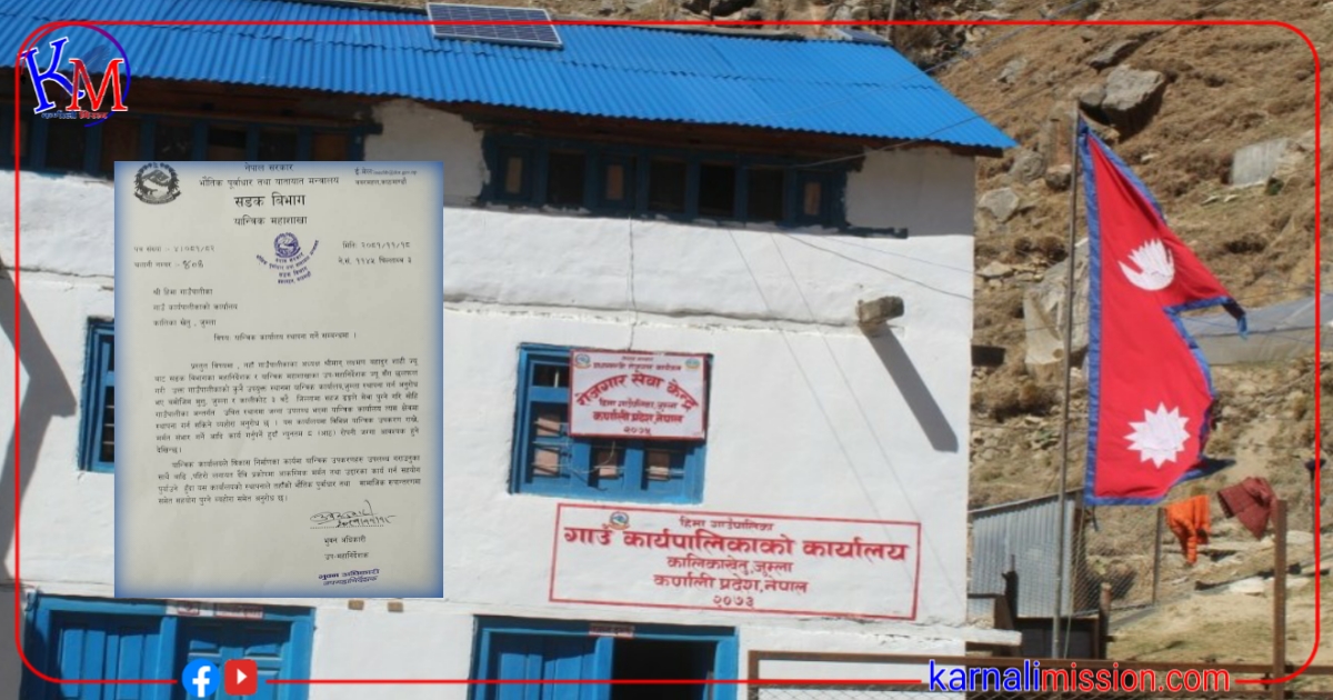 आईतबार हिमा गाउँपालिकालाई परिपत्र गर्दै सडक विभागले भनेकाे छ,’गाउँपालीकाका अध्यक्ष श्रीमान् लक्ष्मण बहादुर शाही ज्यू बाट सडक विभागका महानिर्देशक र यान्त्रिक महाशाखाका उप-महानिर्देशक ज्यू सँग छलफल गरी उक्त गाउँपालीकाको कुनै उपयुक्त स्थानमा यान्त्रिक कार्यालय, जुम्ला स्थापना गर्न अनुरोध भए बमोजिम मुगु, जुम्ला र कालीकोट ३ वटै जिल्लामा सहज ढङ्गले सेवा पुग्ने गरी सोहि गाउँपालीका अन्तर्गत उचित स्थानमा जग्गा उपलब्ध भएमा यान्त्रिक कार्यालय त्यस क्षेत्रमा स्थापना गर्न सकिने व्यहोरा अनुरोध छ ।’