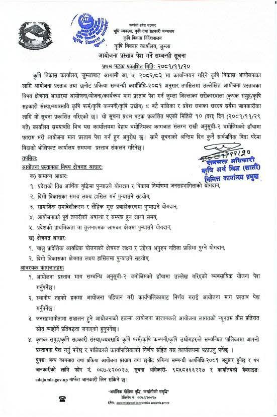 आयाेजना पेश गर्नेबारे कृषि विकास कार्यालय जुम्लाकाे सूचना