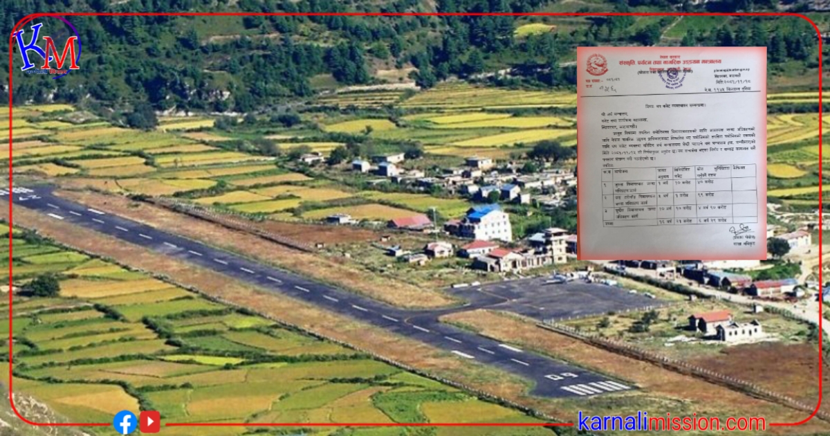 यदपी फागुन १५ गतेकाे मन्त्री स्तरकाे निर्णयबाट विमानस्थलकाे जग्गा अधिग्रहणका लागि नागरिक उड्यन प्राधिकरणबाट सिफारिस भए बमाेजिम चालू आवमा थप ४० कराेड बजेट सुनिश्चिताका लागि माग गरिएकाे छ ।