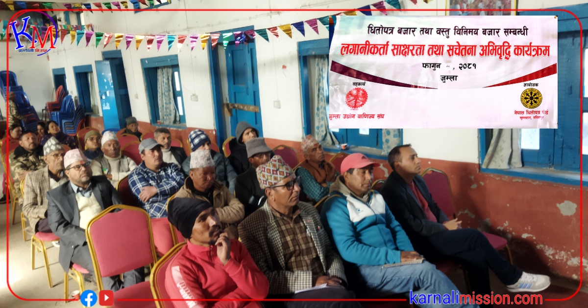 पूँजी बजारलाई व्यवस्थित गर्न,साना तथा ठुला लगानीकर्ताको हक हित संरक्षण तथा पूँजी बजारको विकासमा टेवा पुराउने उदेश्यले कर्णालीका जिल्ला जिल्लामा पुगेर धितोपत्र बजार तथा वस्तु विनिमय बजार सम्बन्धी लगानीकर्ता साक्षरता तथा सचेतना अभिबृद्धि कार्यक्रम गरिएको छ ।