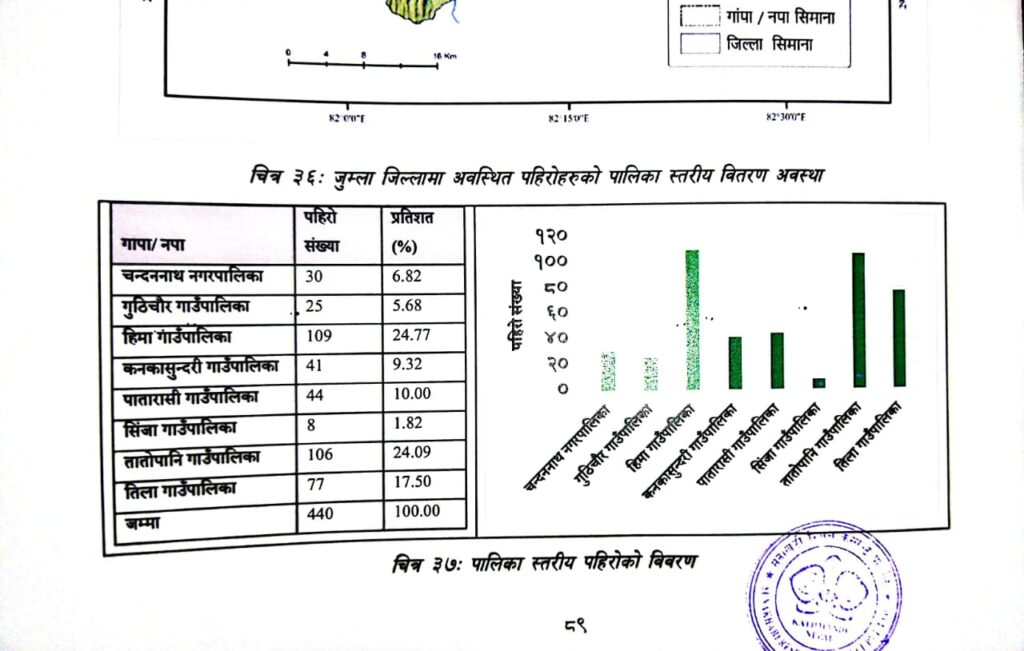 अध्ययनका क्रममा जुम्लाका गाउँगाउँमा पुगेका भू–गर्भ विद् पौडेल भन्छन्, ‘हामीले गरेको अध्ययन अनुसार २०७९ पछि जुम्लामा मात्रै चार सय ४० वटा पहिरो खसेको भेटियो । जसमध्य सबैभन्दा बढी हिमामा १०९, तातोपानीमा १०६, तिलामा ७७, कनकासुन्दरीमा ४१, पातारासीमा ४०, गुठिचौरमा २५, चन्दननाथमा ३० र सिंजा गाउँपालिकामा ८ वटा पहिरो खसेको भेटिएको छ । कमजोर भूगोलमा अत्यधिक सडक निर्माण, बेमौसमी वर्षा मुख्य कारण हुन् ।’