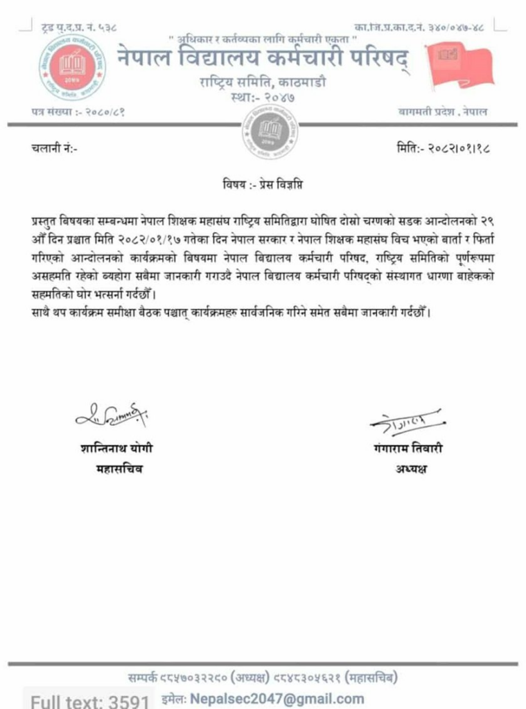 काठमाडौँ । विद्यालय कर्मचारीहरूले सरकारसँग भएको ९ बुँदे सहमति अस्वीकार गरेको छ। नेपाल विद्यालय कर्मचारी परिषद्का अध्यक्ष गंगाराम तिवारी र महासचिव शान्तिनाथ योगीले विज्ञप्ति जारी गर्दै उक्त सहमतिमा आपत्ति जनाएका हुन्।
