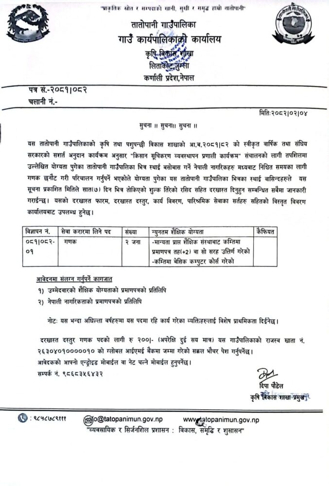 गणक आबश्यकताबारे ताताेपानी गाउँपालिकाकाे सूचना