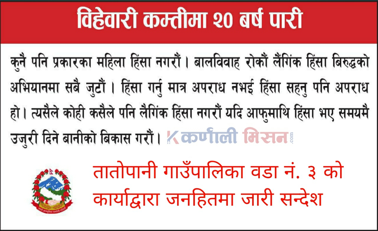 ताताेपानी गाउँपालिका वडा नं-३ काे जनहितमा जारी सन्देश