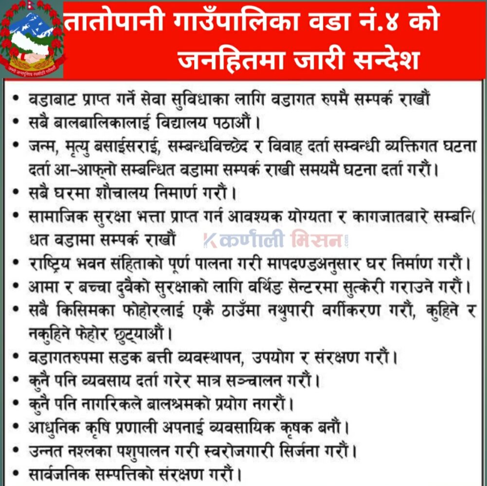 ताताेपानी गाउँपालिका वडा नं.४ काे जनहितमा जारी सन्देश
