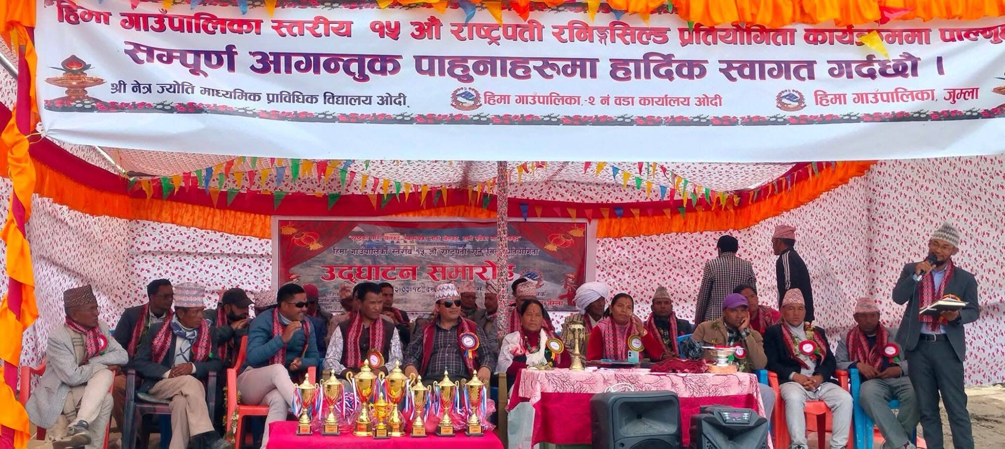 जुम्ला । जुम्लाको हिमा गाउँपालिकामा पालिका स्तरीय राष्ट्रपति रनिङशिल्ड प्रतियोगिता सुरु भएको छ । हिमा गाउँपालिकाको आयोजनामा वडा नं. २ स्थित नेत्र ज्योती माध्यमिक प्राविधिक विद्यालयमा आईतबार देखी १५ औँ राष्ट्रपति रनिङशिल्ड प्रतियोगिता सुरु भएको हो ।