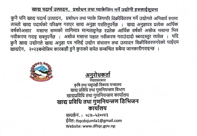 खाद्य प्रविधि तथा गुण नियन्त्रण कार्यालय जुम्लाको जनहितमा जारी सन्देश