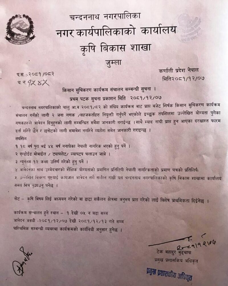 किसान सूचिकरण सम्बन्धी चन्दननाथ नगरपालिकाको सूचना