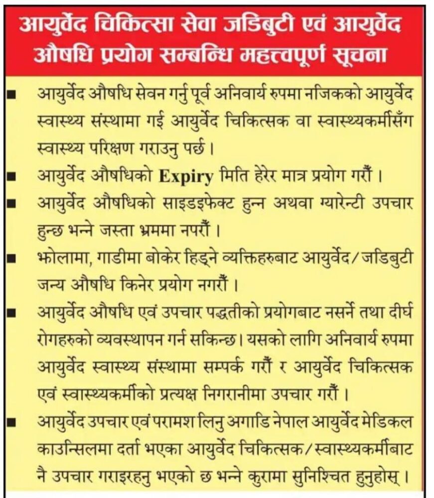 आयूर्वेद केन्द्रको जनहितमा जारी सन्देश