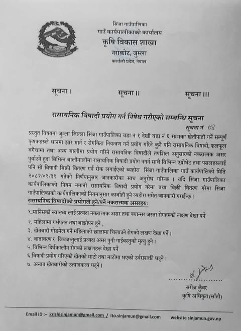 विषादी प्रयोग नगर्नेबारे सिंजा गाउँपलिकाको सूचना