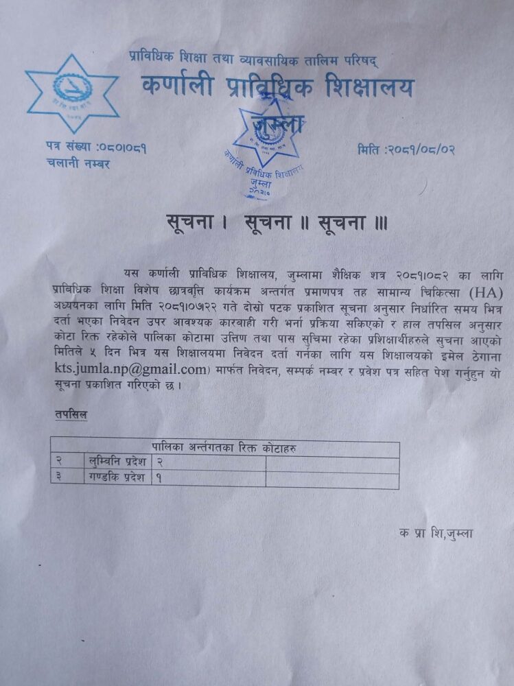 कर्णाली प्राविधिक शिक्षालय जुम्लाकाे सूचना
