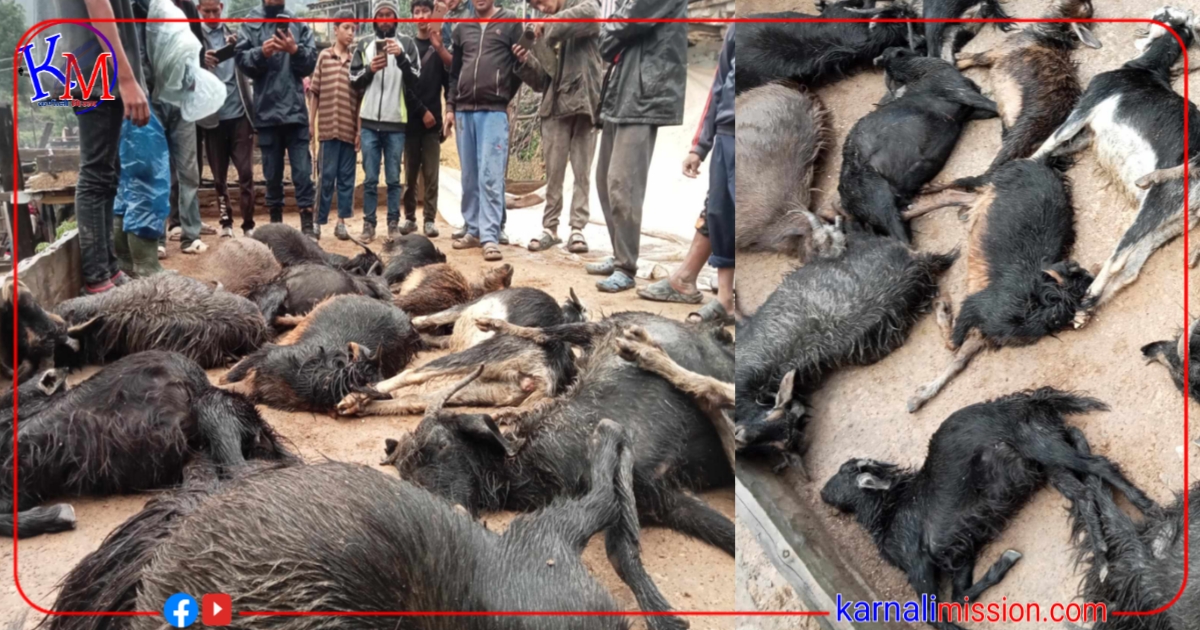 मुगु । अविरल वर्षा संगै चट्याङ लागेर मुगुमा एकै किसानका १४ बाख्रा मरेका छन् ।विहिबार दिउँसाे चट्याङ लागेर छायाँनाथ रारा नगरपालिका वडा नं ८ झ्यारी गाउँका किसान देवचन्द्र रावलका १४ वटा बाख्रा मरेका हुन् । भने चार वटा बाख्रा घाईते भएका छन् ।