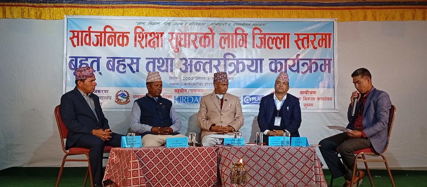 सामाजिक विकास कार्यालय जुम्लाका प्रमुख टोप बहादुर बुढाले संघीयता पछि सामुदायिक विद्यालयको शैक्षिक अबस्था खस्कीदै गएको बताए । कुल बजेटको २० प्रतिशत शिक्षा विनियोजन गर्नुपर्ने व्यवस्था भएपनि बजेट विनियोजन निकै कन्जुसाई गरेको उल्लेख गरे । जुम्लाको सार्वजानिक शिक्षा सुधारका निम्ती केही नयाँ अभ्यास गर्न र स्थानीय सरकारका प्रमुखहरुको ध्यानर्कषण गराउन बृहत्त बहस कार्यक्रमको आयोजना गरिएको उल्लेख गरे ।