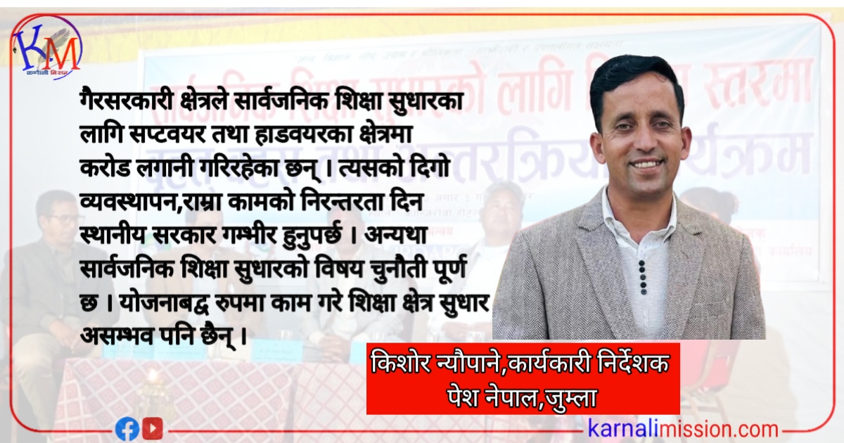 जुम्ला । सार्वजानिक शिक्षा सुधारका निम्ति सरकारले अर्वाै बजेट खर्च गरिरहेकाे छ । तर अपेक्षित रुपमा शिक्षा क्षेत्रकाे सुधार हुन नसकेकाे गुनासाहरु यथावत छन् । शिक्षा क्षेत्रमा सरकारी निकाय जत्तीकै विकास साझेदार संघ संस्थाहरु पनि लगानी गरिरहेकै छन् ।