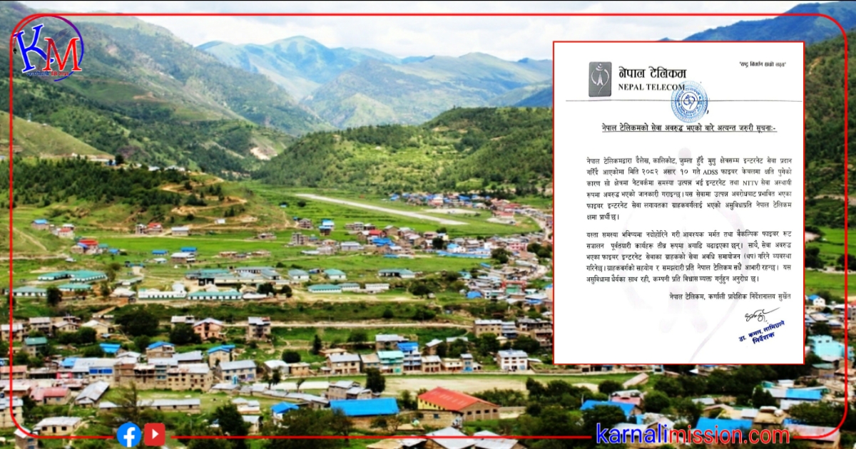 जुम्ला । जुम्ला सहित कर्णाली प्रदेशका विभिन्न जिल्लामा नेपाल टेलिकमको फाईबर नेट अबरुद्ध भएपछि नागरिकको दैनिकी कष्टकर बनेको छ । जुम्लामा करिब ३ दिन यता नेपाल टेलिकमको फोन तथा ईन्टरनेटले काम गर्न छोडेपछि दैनिकी कष्टकर बनेको हो ।