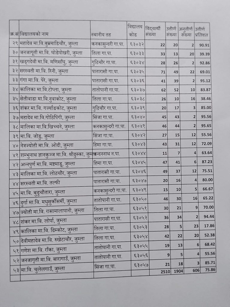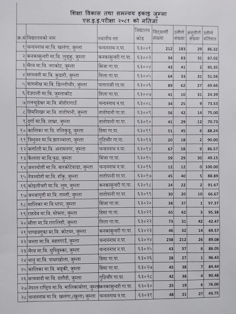 नेत्रज्योती मावि हाँकुका ४५ जना मध्ये ४० जना विद्यार्थी एसईइ परीक्षामा उत्तीर्ण भएका छन् । कैलाश मावि फुग्रका ५९ जना मध्ये २९ जना विद्यार्थी उत्तीर्ण भएका छन् । कर्णाली मावि अनामनगरका ६७ जना मध्ये ५८ जना विद्यार्थी एसईइ परीक्षामा उत्तीर्ण भएका छन् । त्रिभुवन मावि झारज्वालाका २० जना मध्ये १८ जना विद्यार्थी उत्तीर्ण भएका छन् । कालिका मावि तलिकुडुका ५१ जना मध्ये ५१ जना मध्ये ४५ जना विद्यार्थी उत्तीर्ण भएका छन् । दुर्गा मावि लाम्राका ४१ जना २९ जना विद्यार्थी उत्तीर्ण भएका छन् । हिमशिखर मावि तातोपानीका ५६ जना मध्ये ४२ जना विद्यार्थी उत्तीर्ण भएका छन् । रत्नचुडेश्वर मावि बोहोरागाउँका ३४ जना मध्ये २५ जना विद्यार्थी एसईइ परीक्षामा उत्तीर्ण भएका छन् । ऋणमोक्ष मावि डिल्लीचौरका ८९ जना मध्ये ६२ जना विद्यार्थी उत्तीर्ण भएका छन् । सरस्वती मावि कुडारीका ६४ जना मध्ये ३३ जना विद्यार्थी उत्तीर्ण, भैरव मावि नराकोटका ४३ जना मध्ये ४१ जना विद्यार्थी उत्तीर्ण र कनकासुन्दरी मावि लुड्कुका ९४ जना मध्ये ६३ जना विद्यार्थी एसईइ परीक्षाामा उत्तीर्ण भएका छन् ।